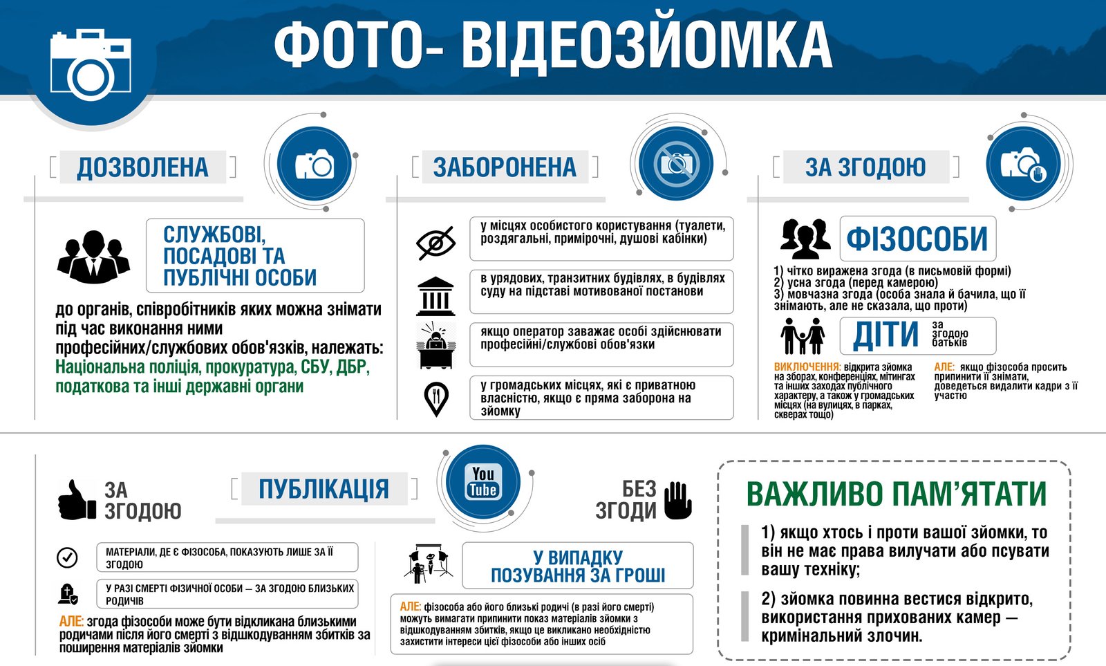 - Стаття 307 Цивільного кодексу України: вимагає, щоб особа, яка знімає, отримала згоду на публічне використання зображення цієї особи.