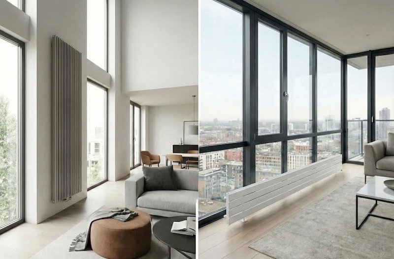 - Вертикальні радіатори: Тренд №1 останніх років. Вони встановлюються на вільну стіну збоку від вікна. Займаючи ширину всього 40-50 см, вони витягуються вгору на 1.8-2 метри. Це економить корисну площу і візуально “піднімає” стелю.